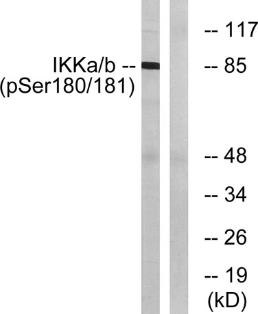 The antiserum was produced against synthesized peptide derived from human IKK-alpha/beta around the phosphorylation site of Ser180/181. AA range:151-200
