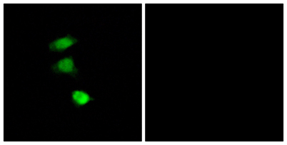 Immunofluorescence analysis of COS7 cells, using IRS-1 (Phospho-Ser307) Antibody. The picture on the right is blocked with the phospho peptide.