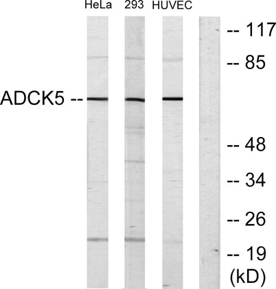 The antiserum was produced against synthesized peptide derived from human ADCK5. AA range:151-200