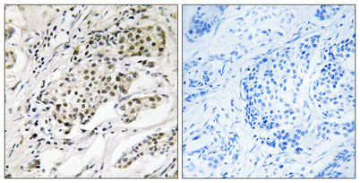 Immunohistochemistry analysis of paraffin-embedded human breast carcinoma, using CDYL2 Antibody. The picture on the right is blocked with the synthesized peptide.