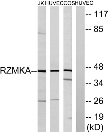 Western blot analysis of lysates from HUVEC, COS, and Jurkat cells, using RIMKA Antibody. The lane on the right is blocked with the synthesized peptide.