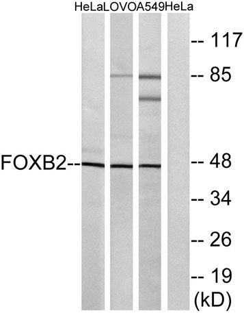 Western blot analysis of lysates from HeLa, LOVO, and A549 cells, using FOXB2 Antibody. The lane on the right is blocked with the synthesized peptide.