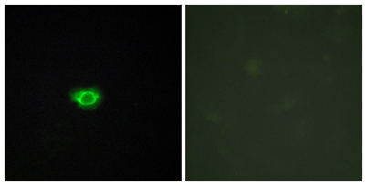 Immunofluorescence analysis of HUVEC cells, using GPR108 Antibody. The picture on the right is blocked with the synthesized peptide.