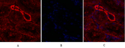 Immunofluorescence analysis of rat-kidney tissue. 1,IRS-1 Polyclonal Antibody(red) was diluted at 1:200(4°C,overnight). 2, Cy3 labled Secondary antibody was diluted at 1:300(room temperature, 50min).3, Picture B: DAPI(blue) 10min. Picture A:Target. Pictur
