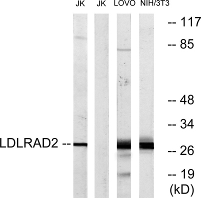 Western blot analysis of lysates from Jurkat, LOVO, and NIH/3T3 cells, using LDLRAD2 Antibody. The lane on the right is blocked with the synthesized peptide.