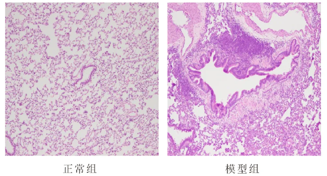 HE染色結(jié)果:正常組肺組織肺泡結(jié)構(gòu)正常,支氣管上皮結(jié)構(gòu)基本完整,無(wú)明顯脫落。模型組肺組織肺泡壁明顯增厚,肺泡腔縮小,間隔增寬,結(jié)構(gòu)紊亂;支氣管、血管周圍,以及肺間質(zhì)可見(jiàn)大量炎細(xì)胞浸潤(rùn);支氣管平滑肌及基底膜明顯增厚,氣道杯狀細(xì)胞增生,氣道黏膜不規(guī)則增生,部分支氣管內(nèi)有上皮細(xì)胞脫落。