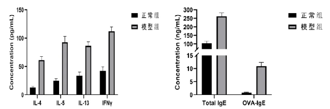 血清炎癥因子檢測(cè)結(jié)果:模型組血清IgE和IL4,IL5,IL13 IFNγ等炎癥因子含量較正常組明顯增加。