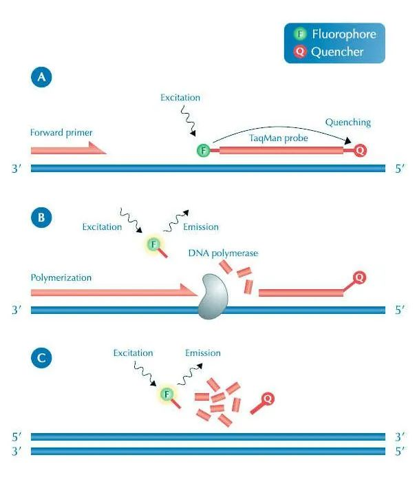 目前根據(jù)不同的熒光物質(zhì),我們可以大致將qPCR分為兩種。一種是用熒光染料,主要為SYBRGreenⅠ染料,該染料能與DNA雙鏈結(jié)合,結(jié)合之后會(huì)顯示熒光信號(hào),而在沒(méi)有結(jié)合的時(shí)候幾乎檢測(cè)不到熒光信號(hào),隨著拷貝數(shù)的增加,熒光信號(hào)增強(qiáng)。而還有一種是使用熒光探針,又叫TaqMan探針?lè)?,其原理是根?jù)目的基因設(shè)計(jì)一個(gè)能與之特異性結(jié)合的熒光探針,該探針包含兩個(gè)基團(tuán):一個(gè)熒光基團(tuán)和一個(gè)淬滅基團(tuán),正常情況下因?yàn)榇銣缁鶊F(tuán)的存在導(dǎo)致熒光基團(tuán)無(wú)法發(fā)出熒光,而在擴(kuò)增時(shí)探針結(jié)合到DNA的模板上,并且擴(kuò)增到探針位置時(shí)兩個(gè)基團(tuán)被切開(kāi),從而熒光基團(tuán)可以發(fā)出熒光,同樣隨著拷貝數(shù)的增加,熒光信號(hào)增強(qiáng)。
