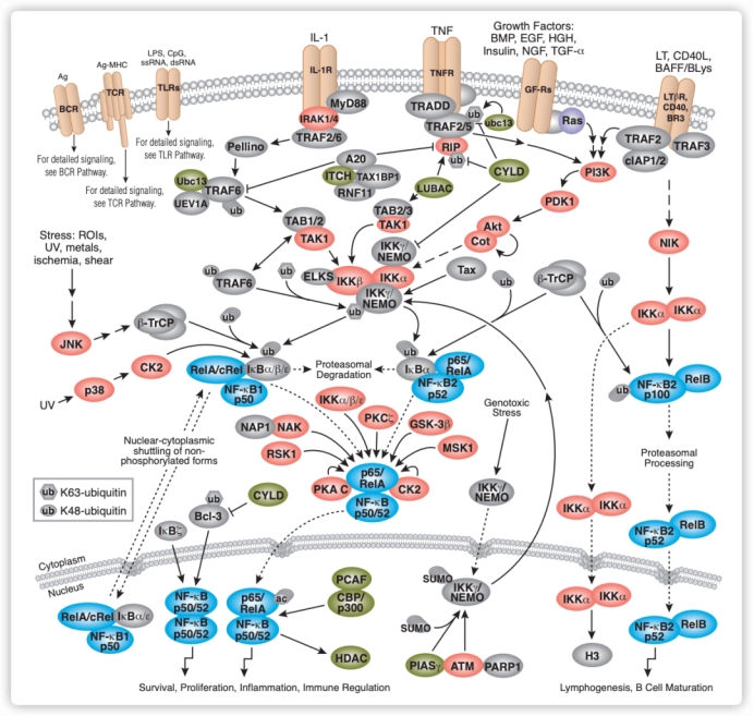 NF-kB家族有由cRel, RelA (p65) , RelB, NF-kB1 (p50)、NF-kB2 (p52)組成,它們在N端都具有Rel同源結(jié)構(gòu)域,其中cReI, ReIA (p65)和ReIB存在轉(zhuǎn)錄激活區(qū)(TAD),可正向調(diào)節(jié)基因表達;p52和p50分別由前體蛋白p100、p105裂解而成,前體蛋白的C端有類似于NF-kB抑制劑(IκB)的結(jié)構(gòu),作為IkB樣蛋白抑制NF-kB功能,它們的同源二聚體可以抑制轉(zhuǎn)錄。