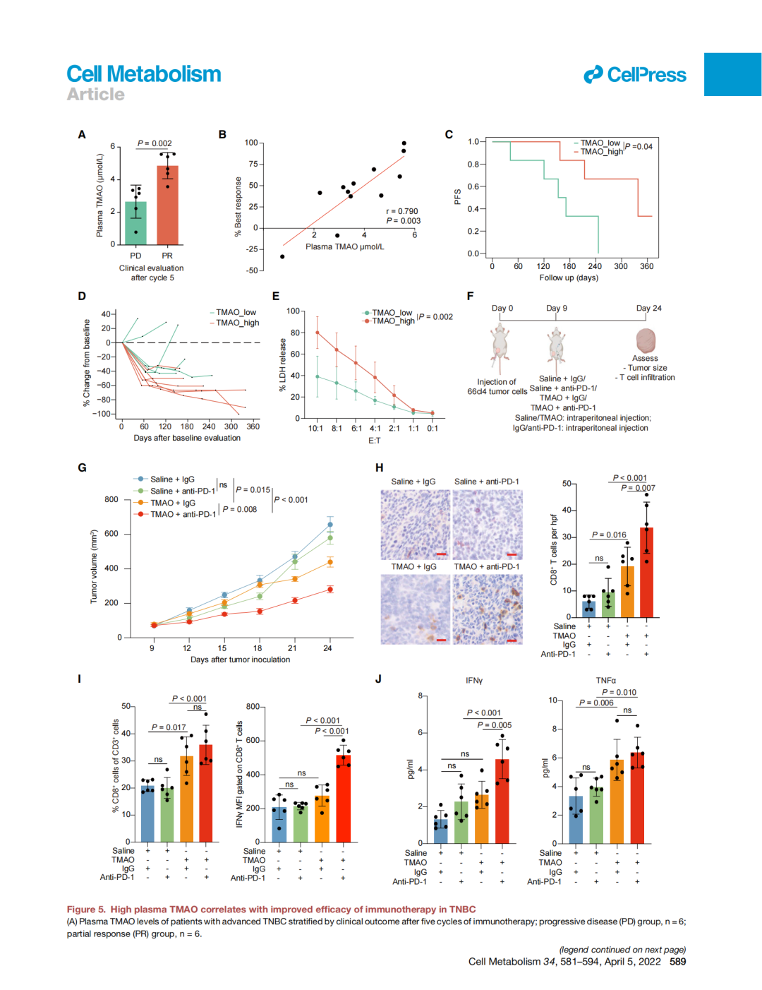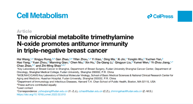 乳腺癌的發(fā)病率逐年增高,并成為中國(guó)女性發(fā)病率最高的惡性腫瘤,是人們常說(shuō)的“紅顏殺手”。其中,三陰性乳腺癌惡性程度較高,患者生存預(yù)后較差,易出現(xiàn)早期復(fù)發(fā)和轉(zhuǎn)移,且既往缺乏有效的針對(duì)性治療策略,素有最“毒”乳腺癌之稱。近日,復(fù)旦大學(xué)腫瘤醫(yī)院邵志敏教授、江一舟教授課題組攜手復(fù)旦大學(xué)基礎(chǔ)醫(yī)學(xué)院教育部/衛(wèi)健委/醫(yī)科院醫(yī)學(xué)分子病毒學(xué)重點(diǎn)實(shí)驗(yàn)室趙超課題組,發(fā)現(xiàn)微生物代謝產(chǎn)物氧化三甲胺(TMAO)可以激活抗腫瘤免疫,提高三陰性乳腺癌免疫治療療效。這意味著微生物代謝產(chǎn)物TMAO有望成為三陰性乳腺癌臨床免疫治療的新策略,助推免疫治療。該項(xiàng)重要研究成果已在北京時(shí)間3月12日凌晨在國(guó)際權(quán)威期刊Cell Metabolism(《細(xì)胞代謝》)以封面文章發(fā)表。