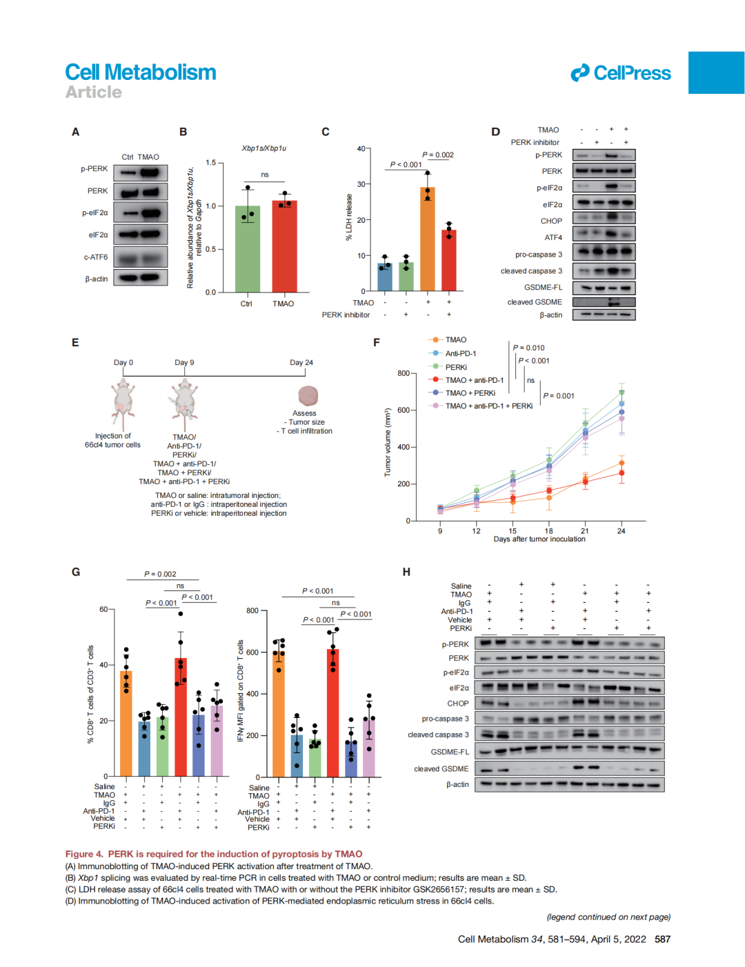 團(tuán)隊(duì)進(jìn)一步探究TMAO是如何幫助人體抑制三陰性乳腺癌的。研究團(tuán)隊(duì)基于小鼠動(dòng)物模型開展相關(guān)實(shí)驗(yàn),發(fā)現(xiàn)上調(diào)瘤內(nèi)TMAO水平可以通過(guò)增加瘤內(nèi)微環(huán)境中CD8+ T細(xì)胞的浸潤(rùn),激活CD8+ T細(xì)胞的功能并有效抑制三陰性乳腺癌的生長(zhǎng)。機(jī)制探索發(fā)現(xiàn),TMAO誘導(dǎo)乳腺癌細(xì)胞發(fā)生由GSDME介導(dǎo)的焦亡,向微環(huán)境內(nèi)釋放大量炎性因子,從而增加微環(huán)境中CD8+ T細(xì)胞的浸潤(rùn),并激活CD8+ T細(xì)胞發(fā)揮抗腫瘤功能。研究同時(shí)發(fā)現(xiàn),TMAO誘導(dǎo)的腫瘤細(xì)胞焦亡與內(nèi)質(zhì)網(wǎng)應(yīng)激密切相關(guān)。TMAO通過(guò)活化PERK蛋白,進(jìn)一步切割GSMDE的上游蛋白caspase-3誘導(dǎo)腫瘤細(xì)胞發(fā)生焦亡。